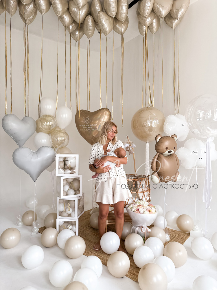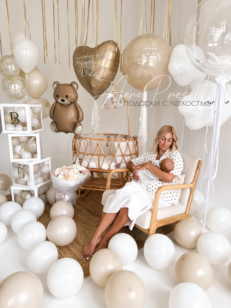 Арка из шаров у входа в дом или квартиру станет эффектным приветствием для новоиспечённых родителей и их малыша. Вы можете выбрать шары в традиционных цветах — розовые для девочки и голубые для мальчика, либо использовать нейтральные и пастельные оттенки.