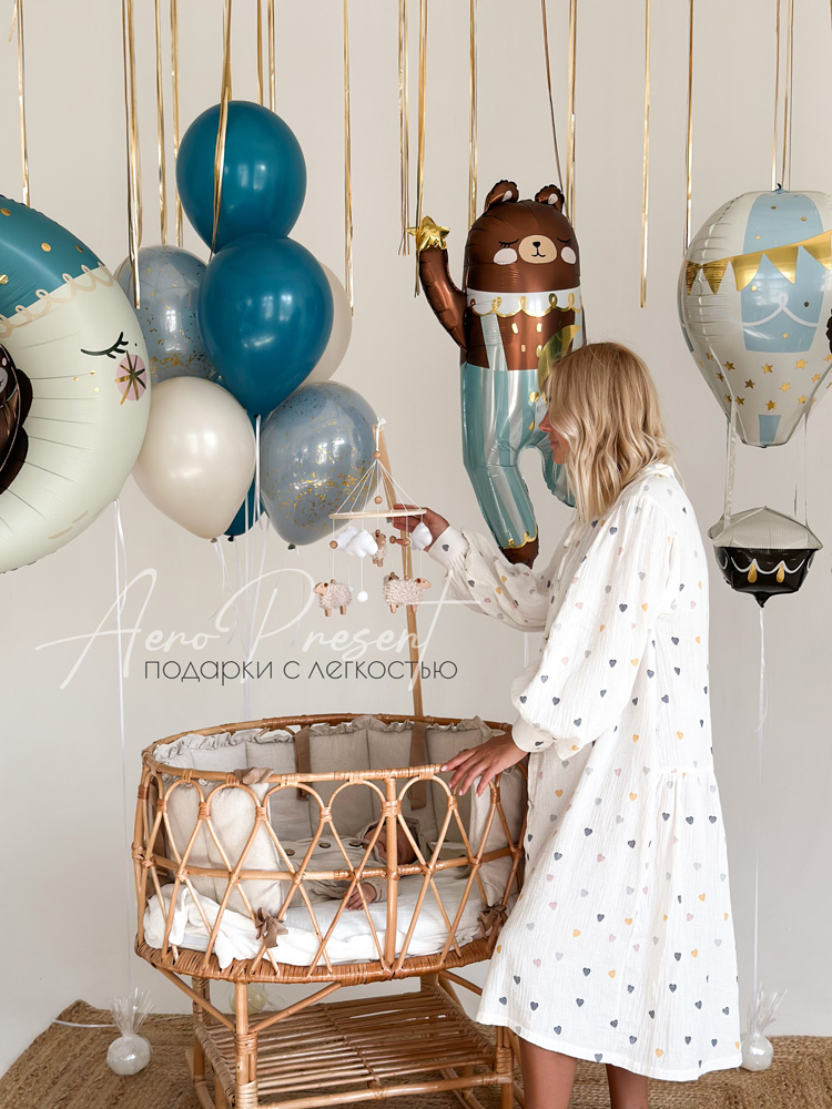 Гелиевые шары, парящие под потолком, создадут атмосферу легкости и праздника. Вы можете привязать к ним ленточки с маленькими игрушками или записками с пожеланиями для малыша и родителей.