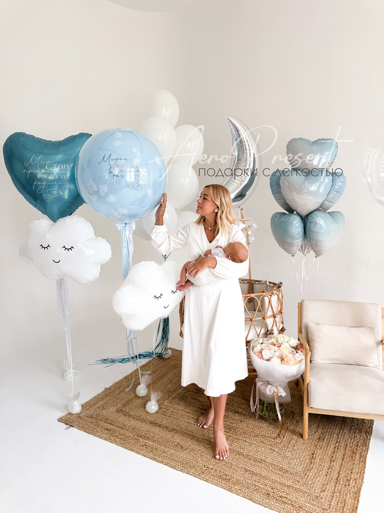 Букеты из воздушных шаров можно разместить в комнате, где будет находиться малыш. Такие букеты могут включать шары в форме звёзд, сердечек, детских бутылочек, колясок и других тематических фигурок.