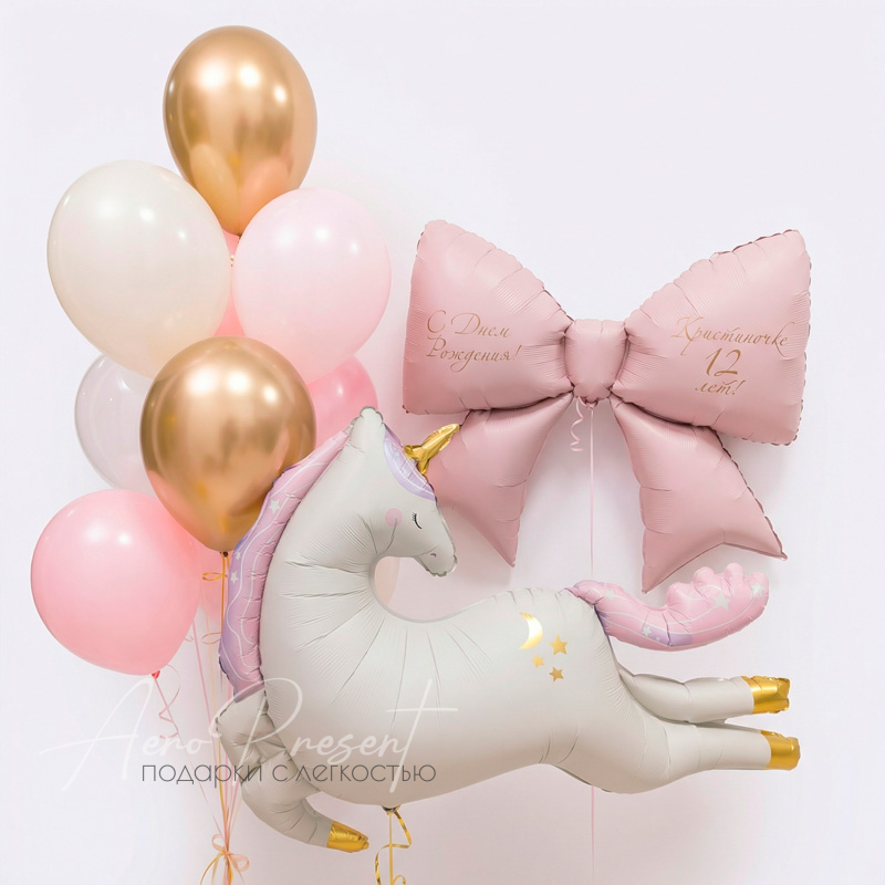 Нежный и очень фотогеничный набор в пудрово‑лавандовой гамме с золотыми акцентами. Большой розовый бант с персональной надписью и милый единорог создают сказочную атмосферу для дня рождения, выписки или детской фотосессии.