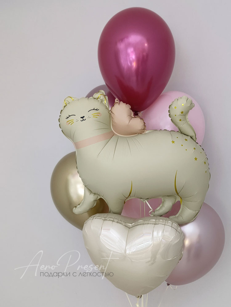 Главный шар в форме милого котика с нежными оттенками бежевого и розового, окружённый блестящими шарами хром, добавит игривости и тепла в ваш праздник.