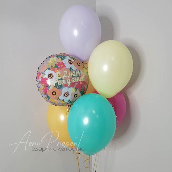Яркий и нежный набор шаров с красивым фольгированным шаром с изображением цветов и поздравительной надписью на нем.