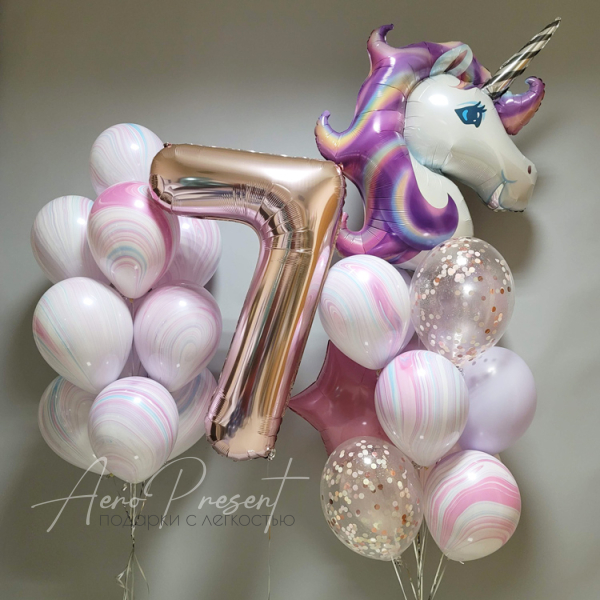 Набор состоит из композиции и 10 мраморных шаров, цифры на выбор, букета из 13 шаров с единорогом, мраморными шарами, фольгированными и шарами с конфетти.