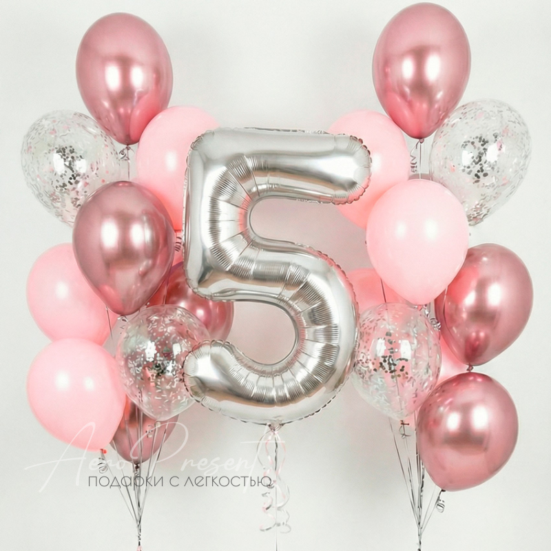 Большая серебряная цифра в центре и облака из перламутровых, матовых и конфетти‑шаров создают идеальный фон для фото и чувствуется настоящий праздник с порога.