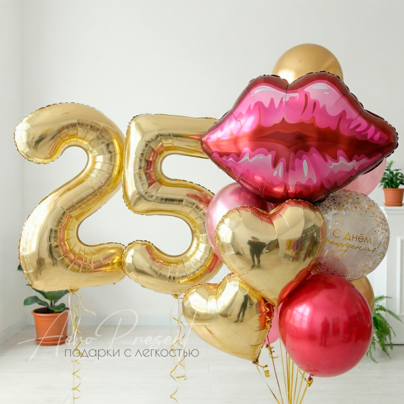 - Букет с шарами в малиново-золотых оттенках, фольгированными золотыми сердцами, шаром в форме губ и шаром с поздравлением