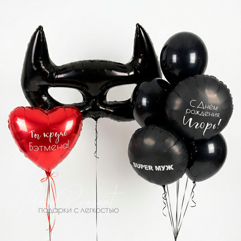Огромная маска в стиле супергероя, алое сердце с признанием «Ты круче Бэтмена» и чёрный букет с персональными надписями — готовое оформление для мужского дня рождения, 23 февраля или неожиданного сюрприза в офисе.