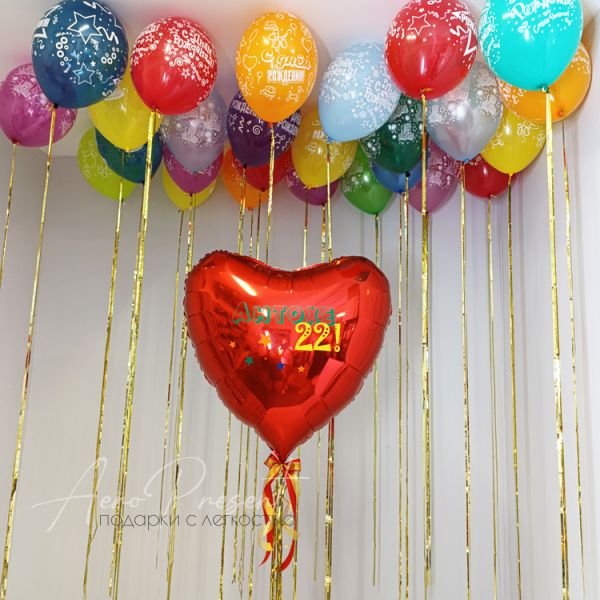 Яркое поздравление С Днём Рождения с 25 шарами с рисунками на потолок и гигантского красного сердца 90 см. с вашей надписью (до 5 слов).