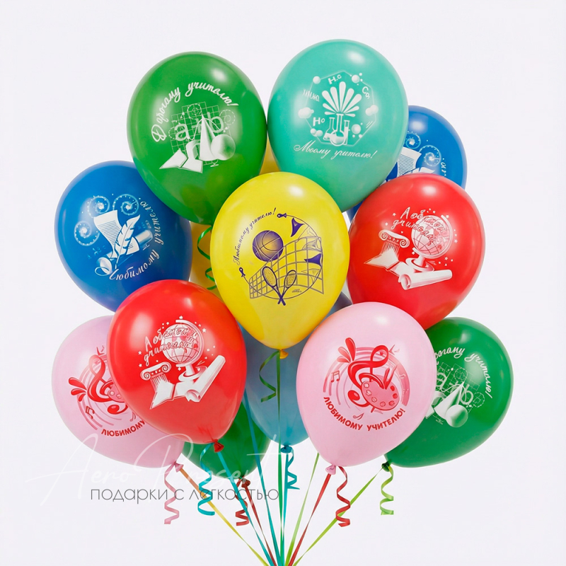 Яркие воздушные шары с надписями «Любимому учителю» и тематическими рисунками (глобус, книги, палитра, колба, формулы, линейка) — стильный способ выразить благодарность педагогу. Идеально подойдут для оформления класса к 1 сентября, на День учителя, Последний звонок, выпускной или школьный юбилей. Такой набор шаров создаст торжественную атмосферу и станет трогательным комплиментом вашему наставнику.