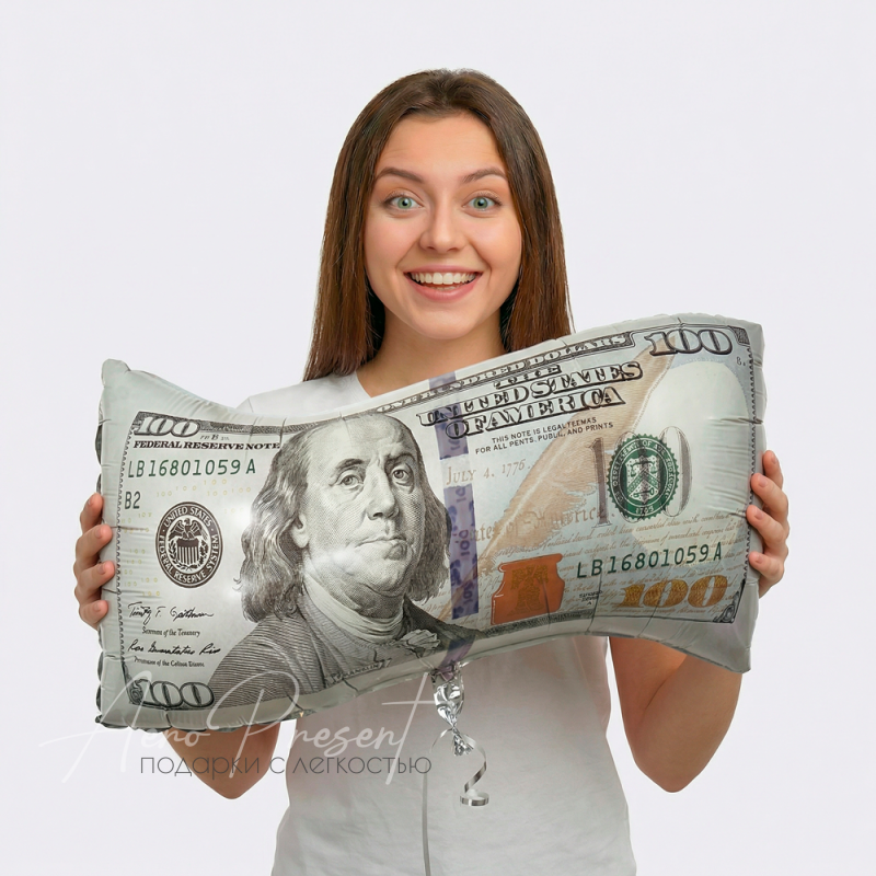 - Фольгированный шар с гелием в виде купюры номиналом 100 долларов . Яркий и оригинальный аксессуар для подарка, который отлично подойдёт для празднования дня рождения, юбилея или любого торжества, связанного с пожеланиями богатства и успеха.