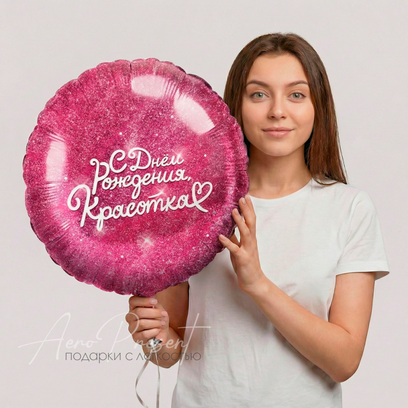 - Фольгированный шар с гелием круглой формы, насыщенного розового цвета с блестящим эффектом и надписью “С Днём Рождения, Красотка” белого цвета. Прекрасный вариант для поздравления девушки, подруги или именинницы, чтобы подчеркнуть её красоту и создать праздничное настроение.