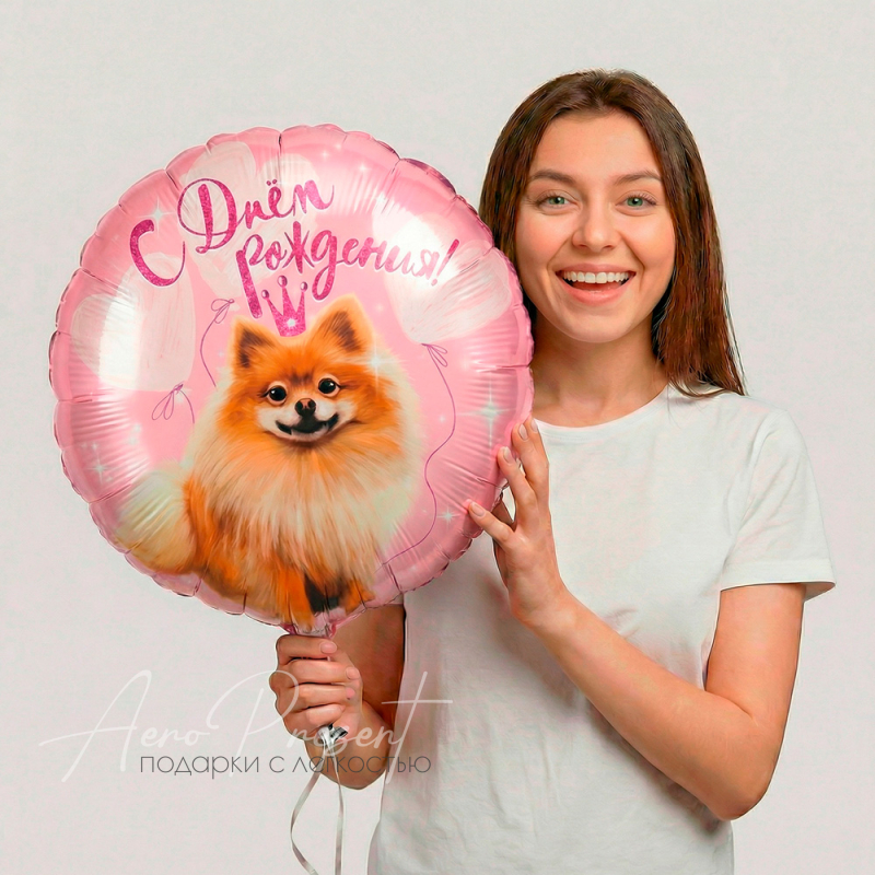 - Фольгированный шар с гелием круглой формы, розового цвета с изображением милого шпица в короне и надписью “С Днём Рождения!”. Весёлый и яркий аксессуар идеально подойдёт для поздравления ребёнка или любителя собак, а также для украшения праздничной вечеринки.