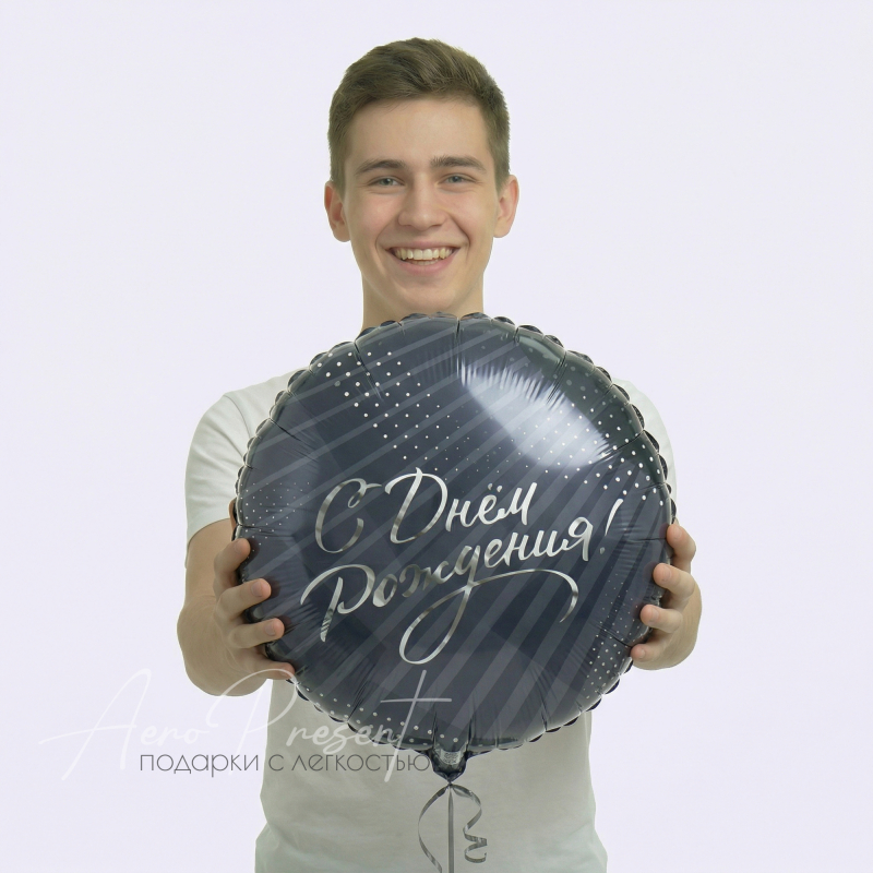 - Фольгированный шар с гелием круглой формы, тёмно-серого цвета с серебристым узором и надписью “С Днём Рождения!”. Стильный вариант для поздравления и украшения любого праздничного мероприятия.