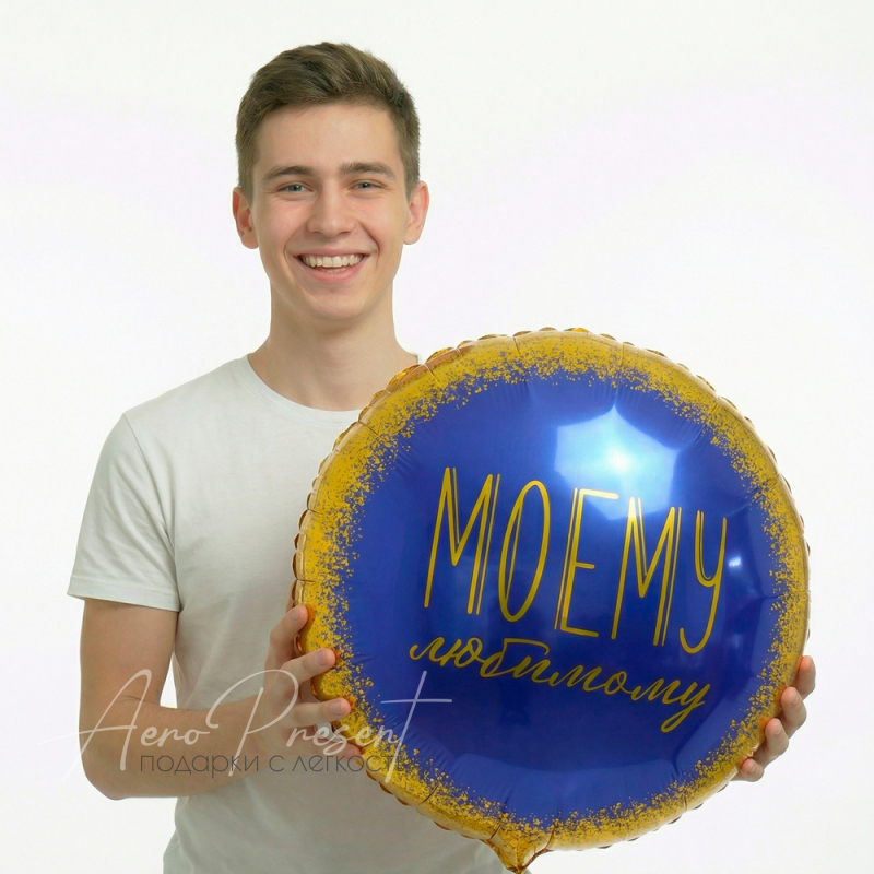 - Фольгированный шар с гелием круглой формы, насыщенного синего цвета с золотистой окантовкой и надписью “МОЕМУ любимому”. Отличный вариант для поздравления и приятного сюрприза дорогому человеку.