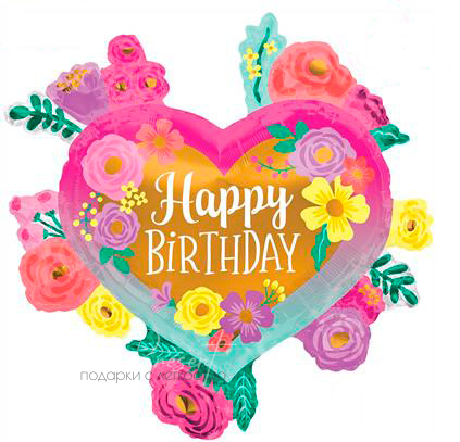- Фольгированный шар с гелием в виде яркого сердца, украшенного разноцветными цветами и надписью «Happy Birthday». Такой шар станет красочным и праздничным украшением для дня рождения, создавая атмосферу радости и веселья.