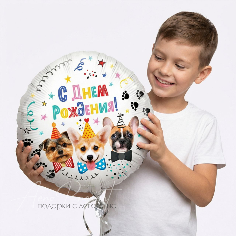 - Фольгированный шар с гелием круглой формы, белого цвета с яркой надписью “С Днем Рождения!” и изображением весёлых щенков. Отлично подойдёт для детского дня рождения и подарит радость любителю животных.