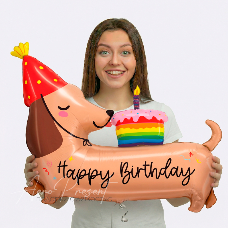 - Фольгированный шар с гелием в форме таксы в праздничном колпаке, со свечкой и радужным тортом на спине. На шаре надпись “Happy Birthday”. Отлично подойдёт для украшения дня рождения и порадует любителей собак.