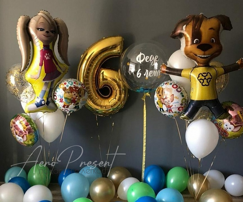- Двух букетов, в каждом: 3 фольгированных тематических шара, 2 латексных шара, 2 шара с конфетти