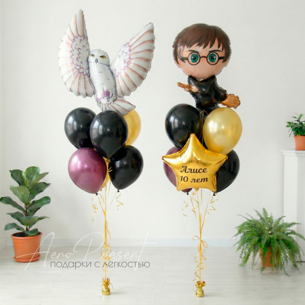 Два напольных букета создают готовую фотозону: белая сова привлекает внимание, а юный волшебник и золотая звезда с именем делают поздравление персональным.