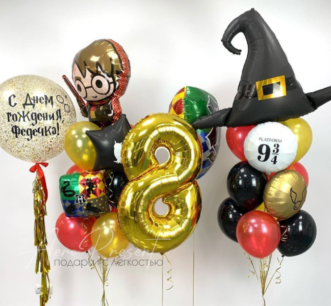 • Двух букетов, в каждом 3 фольгированных тематических шара, 10 латексных шаров