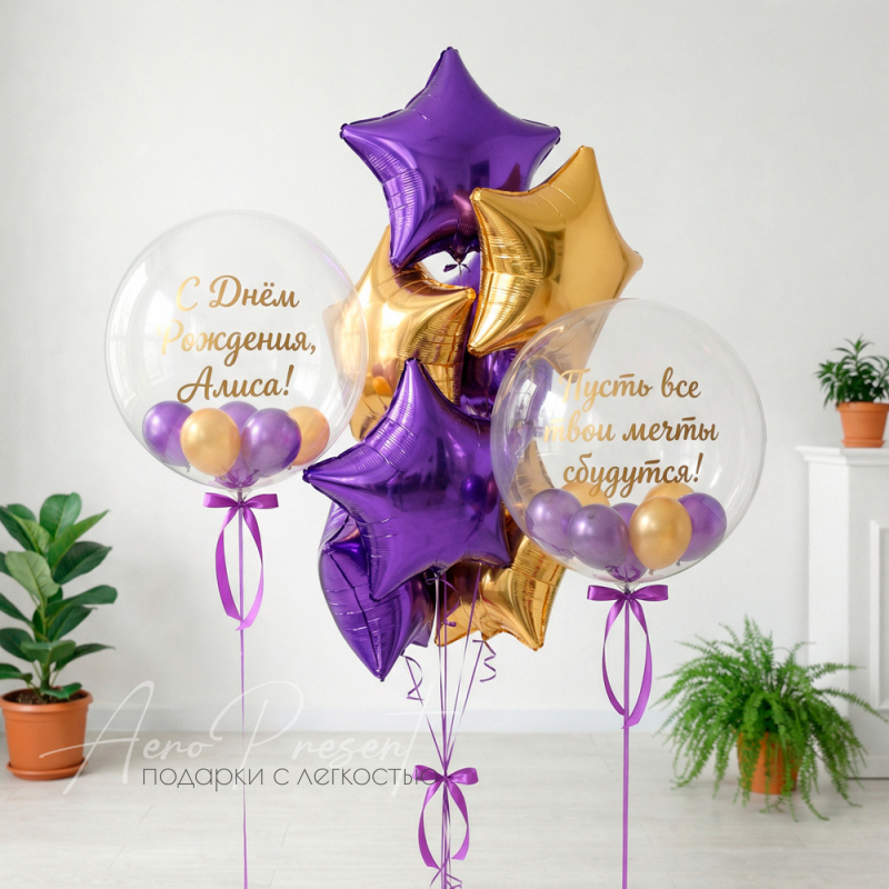 2 баблсов с индивидуальной надписью и наполнением шариками;