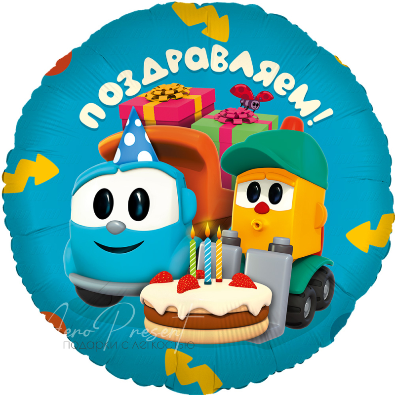 - Фольгированный шар с гелием круглой формы с изображением мультяшных машинок, праздничного торта со свечами и подарков на голубом фоне. В верхней части шара надпись «Поздравляем!». Отлично подойдёт для украшения детского дня рождения или тематической вечеринки.
