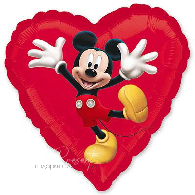 - Фольгированный шар с гелием в форме сердца с изображением Микки Мауса на ярко-красном фоне. Такой шар отлично подойдёт для оформления детского праздника, дня рождения или как приятный подарок для поклонников классических мультфильмов Disney.