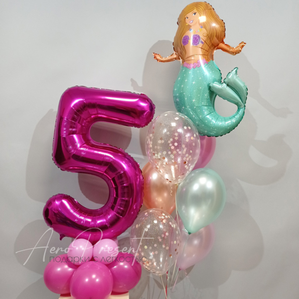 Композиция с фольгированной цифрой на выбор и букетом из шаров в стиле "Русалочка"