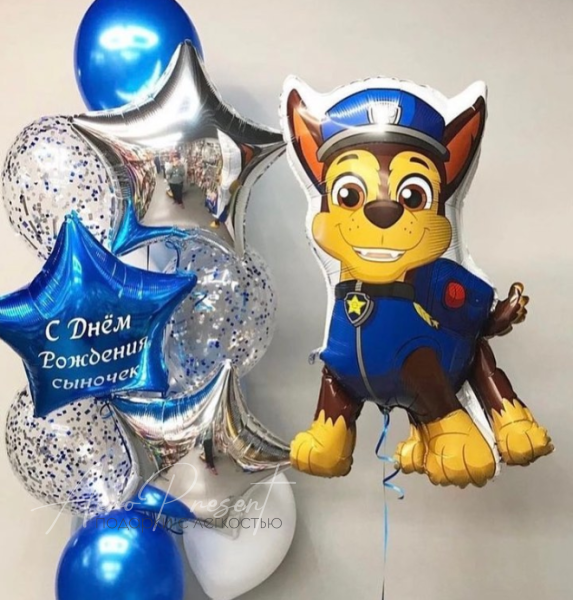 - Букета из 3 фольгированных шаров (один из них с надписью), 3 шаров с конфетти, 7 латексных шаров