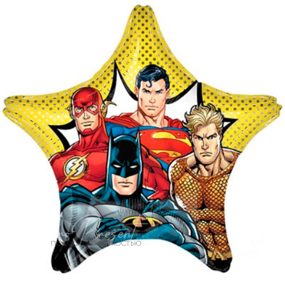 - Фольгированный шар с гелием в форме звезды с изображением супергероев: Бэтмена, Супермена, Флэша и Аквамена. Идеально подойдёт для украшения детских праздников и вечеринок в стиле супергероев.