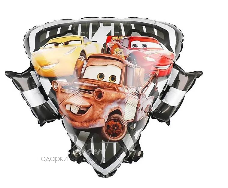 - Фольгированный шар с гелием с изображением героев мультфильма «Тачки». На шаре изображены Молния МакКуин, Мэтр и Крус Рамирес на фоне черно-белого флага. Отлично подойдёт для украшения детского дня рождения или тематической вечеринки для поклонников мультфильма.