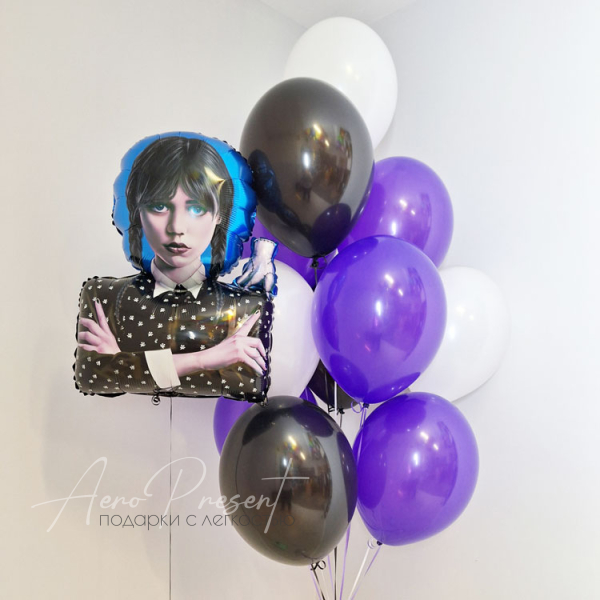Набор шаров в стиле "Уэнсдэй" мрачной девочкой - героиней популярного сериала.