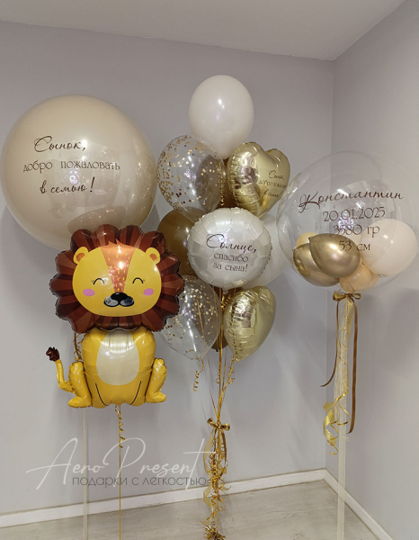 - Фонтан из 5 латексных матовых шаров, 2 шаров с конфетти и 3 фольгированных сердец.