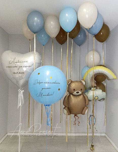 - Фонтан из 5 латексных и 2 фольгированных шаров;