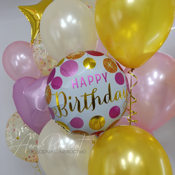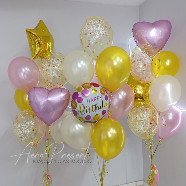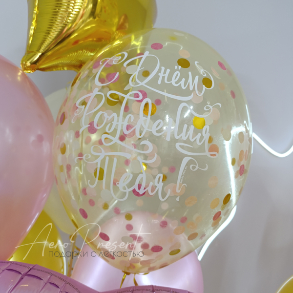 Оригинальный воздушный набор состоящий из 3 композиций по 10 шаров, в составе которых шары с конфетти, шары металлик, фольгированные шары без рисунка и с рисунком