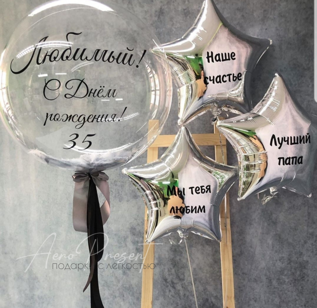 Набор с шаром бабблсом с надписью и 3 фольгированными звездами с надписями