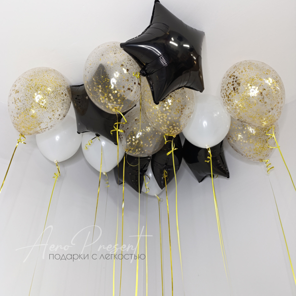 Набор воздушных шаров в бело-черно-золотой гамме с фольгированными звездами и шарами с наполнением конфетти.