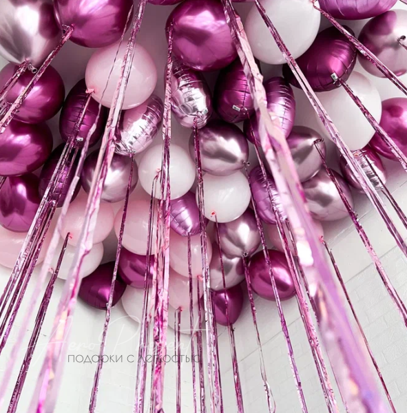 В комплекте шаров используются розовые оттенки фольгированных сердец, шаров хром и матовых шаров без рисунка