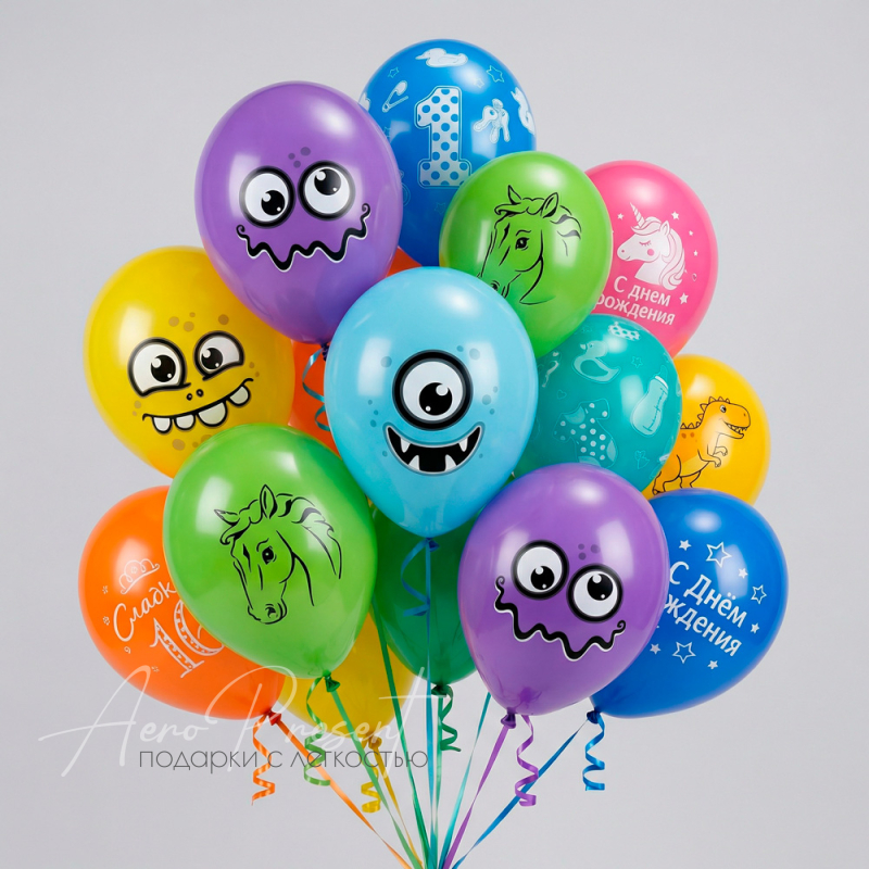 Яркие разноцветные воздушные шары с забавными мордашками монстриков, лошадками, единорогами, динозавром и праздничными надписями «С Днем Рождения» и «1 годик» — идеальный декор для детского дня рождения или тематической вечеринки. Весёлые рисунки и насыщенные цвета создают атмосферу настоящего праздника, дарят радость, смех и море положительных эмоций. Такие шары отлично подойдут для оформления комнаты, фотозоны или для сюрприза для маленького именинника и его гостей!