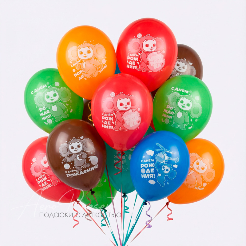 Яркие шары с Чебурашкой и поздравительной надписью «С Днём Рождения!» моментально создают праздничное настроение и радуют детей.