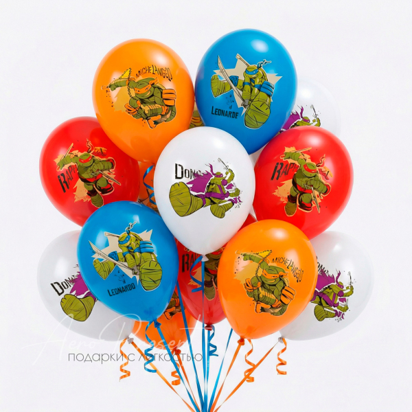 Яркие воздушные шары с изображениями любимых героев — Леонардо, Рафаэля, Донателло и Микеланджело из мультфильма «Черепашки-ниндзя»! Оранжевые, синие, красные и белые шары с красочными и деталированными рисунками идеально подойдут для оформления дня рождения, детской вечеринки или сюрприза для поклонников этих смелых ниндзя. Такой букет точно понравится юным супергероям и добавит энергии, веселья и динамики вашему празднику.