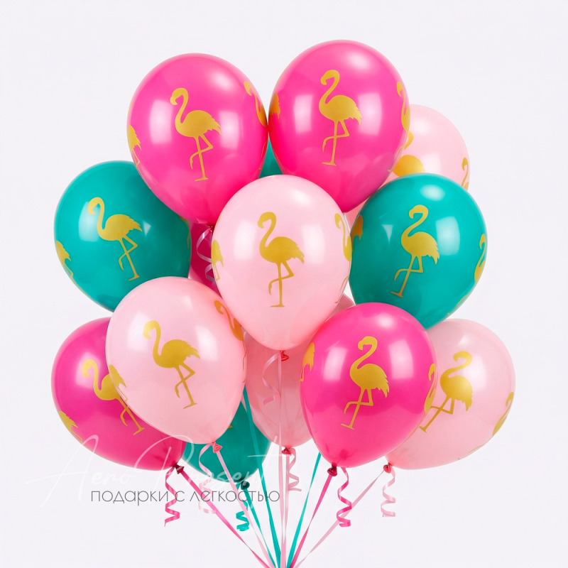 Яркие воздушные шары с золотым силуэтом фламинго — идеальное украшение для летней вечеринки, девичника, дня рождения, выпускного или стильной фотозоны. Комбинация розовых, мятных и нежно-розовых шаров дарит атмосферу тропиков, радости и лёгкости, а изящные фламинго привлекают внимание и поднимают настроение. Шары прекрасно подойдут для создания праздничного антуража и станут отличным акцентом на любом мероприятии.