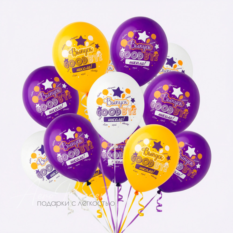 Яркие воздушные шары с надписями «Выпуск GOODBYE школа!» — идеальный выбор для оформления выпускного вечера или последнего звонка. Красочные оттенки (жёлтый, фиолетовый, белый) и праздничный дизайн создают атмосферу радости, воспоминаний и новых начинаний. Такие шары украсят зал, фотозону или прогулку выпускников, поддержат праздничное настроение и станут отличным аксессуаром для памятных фотографий.