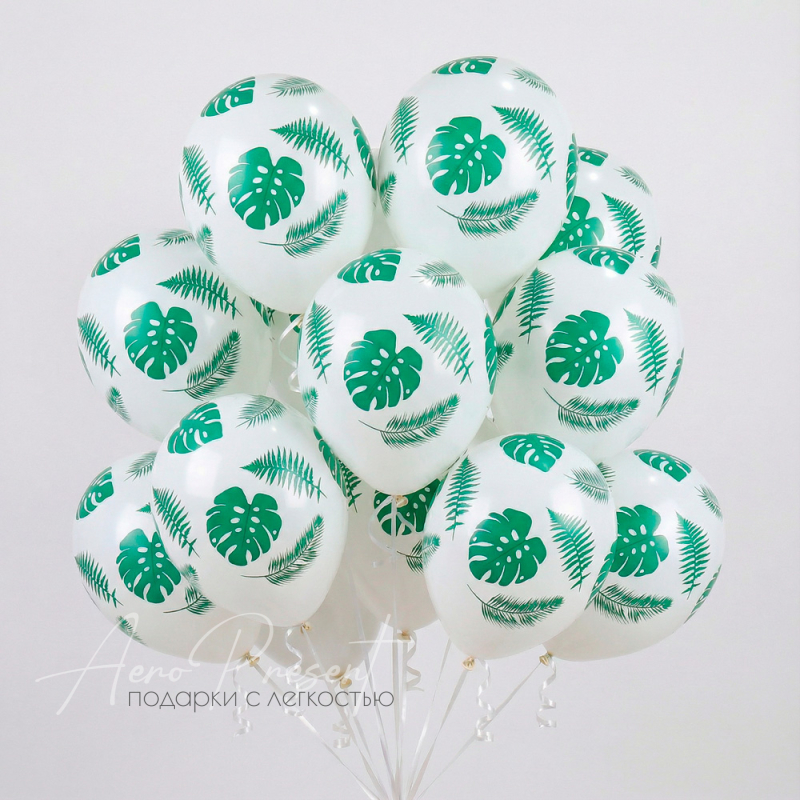 Белые воздушные шары с зелёными тропическими листьями (монстера и пальма) станут стильным акцентом для любого праздника! Такой декор отлично подойдёт для летней вечеринки, дня рождения, свадьбы в эко-стиле, тематического мероприятия или фотозоны. Свежий и современный дизайн добавит атмосферы уюта и природной гармонии, создавая ощущение настоящего тропического оазиса.