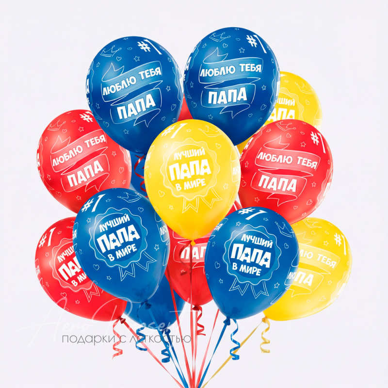 Яркие воздушные шары с надписями «Лучший папа в мире» и «Люблю тебя, папа» в красном, синем и жёлтом цветах — замечательный способ поздравить самого дорогого человека с праздником, днём рождения или просто выразить благодарность и любовь. Такие шары отлично подойдут для оформления дома, семейного торжества или как приятный сюрприз без повода. Сочная палитра и добрые слова сделают настроение по-настоящему праздничным!
