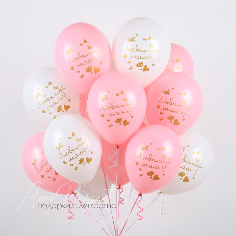 Воздушные шарики нежных оттенков с золотой надписью «Любимой маме!» и украшениями в виде сердечек, цветов и бабочек — прекрасный способ выразить благодарность и любовь самому главному человеку. Эти шары создадут атмосферу уюта и заботы на день рождения, День матери или просто для поднятия настроения маме.