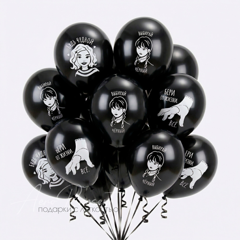 Оригинальные чёрные воздушные шары с белыми графичными рисунками и надписями — идеальный выбор для поклонников неординарного стиля и юмора. На шарах изображены стильные героини, узнаваемая рука и фразы: «Будь чудной», «Выбирай чёрный», «Бери от жизни всё». Такой набор отлично подойдёт для тематических вечеринок, дня рождения, необычных фотосессий или в подарок настоящим индивидуалистам. С этими шарами праздник станет атмосферным и выразительным!