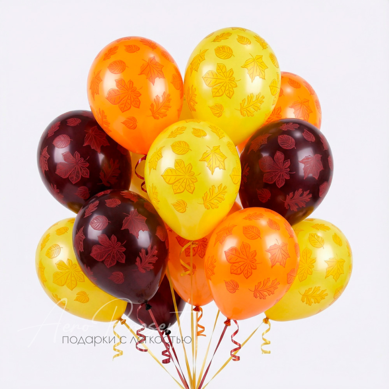 Эффектные воздушные шары в теплых осенних оттенках — желтом, оранжевом и бордовом — украшены ярким принтом осенних листьев. Такой букет станет прекрасным украшением для осеннего праздника, тематической фотосессии, школьных мероприятий, Дня учителя или просто для создания уютной атмосферы в доме или офисе. Шары передают настроение золотой осени и обязательно порадуют гостей любого возраста!