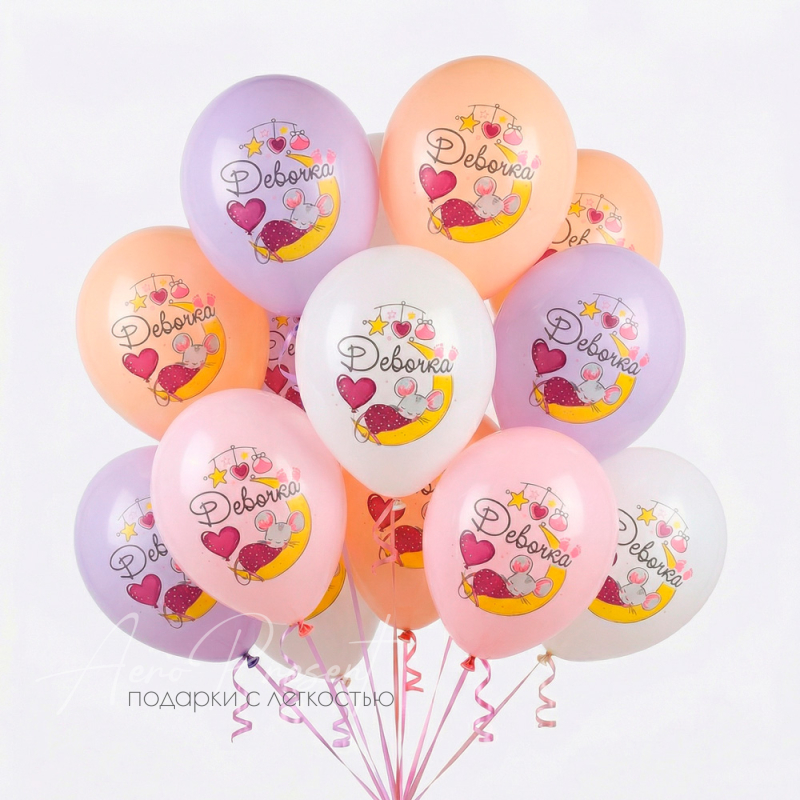 Нежные воздушные шары пастельных оттенков с милым рисунком мышки на луне, сердечками и надписью «Девочка» — идеальный декор для встречи малышки, выписки из роддома, дня рождения или первого фотосета. Яркие и нежные цвета создают атмосферу уюта, теплоты и радости, делая праздник ещё более трогательным и запоминающимся. Такой воздушный букет обязательно порадует как маму, так и маленькую принцессу!