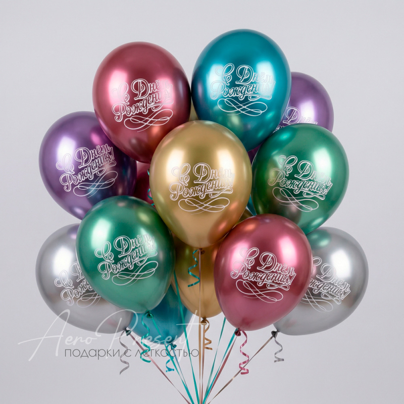 Хромированные шары - металлик с изящной надписью «С Днём Рождения!» выглядят по‑настоящему эффектно и придают празднику премиальный блеск.