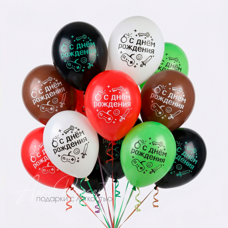 Комплект стильных воздушных шаров с тематикой видеоигр и поздравительной надписью «С Днём Рождения!» станет идеальным украшением для праздника настоящего геймера. Шары разных цветов — чёрные, красные, белые, зелёные и коричневые — украшены рисунками джойстика, меча и веселых символов, которые понравятся как детям, так и взрослым фанатам игр. Такой шариковый букет отлично подойдёт для оформления вечеринки, фотозоны или в качестве яркого подарка.